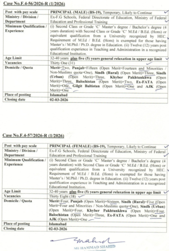 This latest job wave, featured in the 2026 consolidated advertisements, targets both male and female candidates, ensuring a balanced leadership structure across the city’s schools and colleges. The vacancies are spread across four primary categories, each with its own specific quota and requirements: Principal (Male) (BS-19): Leadership roles for male-only educational institutions. Principal (Female) (BS-19): Leadership roles for female-only educational institutions. Vice Principal (Male) (BS-18): Mid-level administrative and teaching support roles. Vice Principal (Female) (BS-18): Mid-level administrative and teaching support roles.