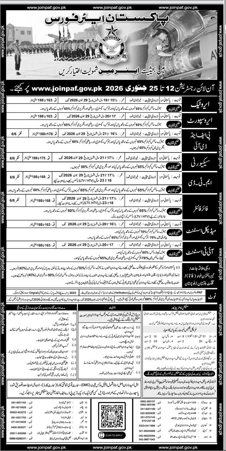 Summary of PAF Airmen Recruitment 2026 The Pakistan Air Force (PAF) is inviting applications for Airmen across various branches, including Aero technician, Security, Medical, and IT Assistant. Registration is open online from January 12 to January 25, 2026. Eligible candidates must be unmarried Pakistani males meeting specific age (typically 15½–21) and height (163–188 cm) requirements. Educational criteria generally require a Matric Science degree with 60–70% marks, though relaxations exist for rural and tribal areas. The selection process involves intelligence, academic, and physical tests. Successful recruits receive competitive salaries, free medical care, housing, and opportunities for international postings and advanced training.