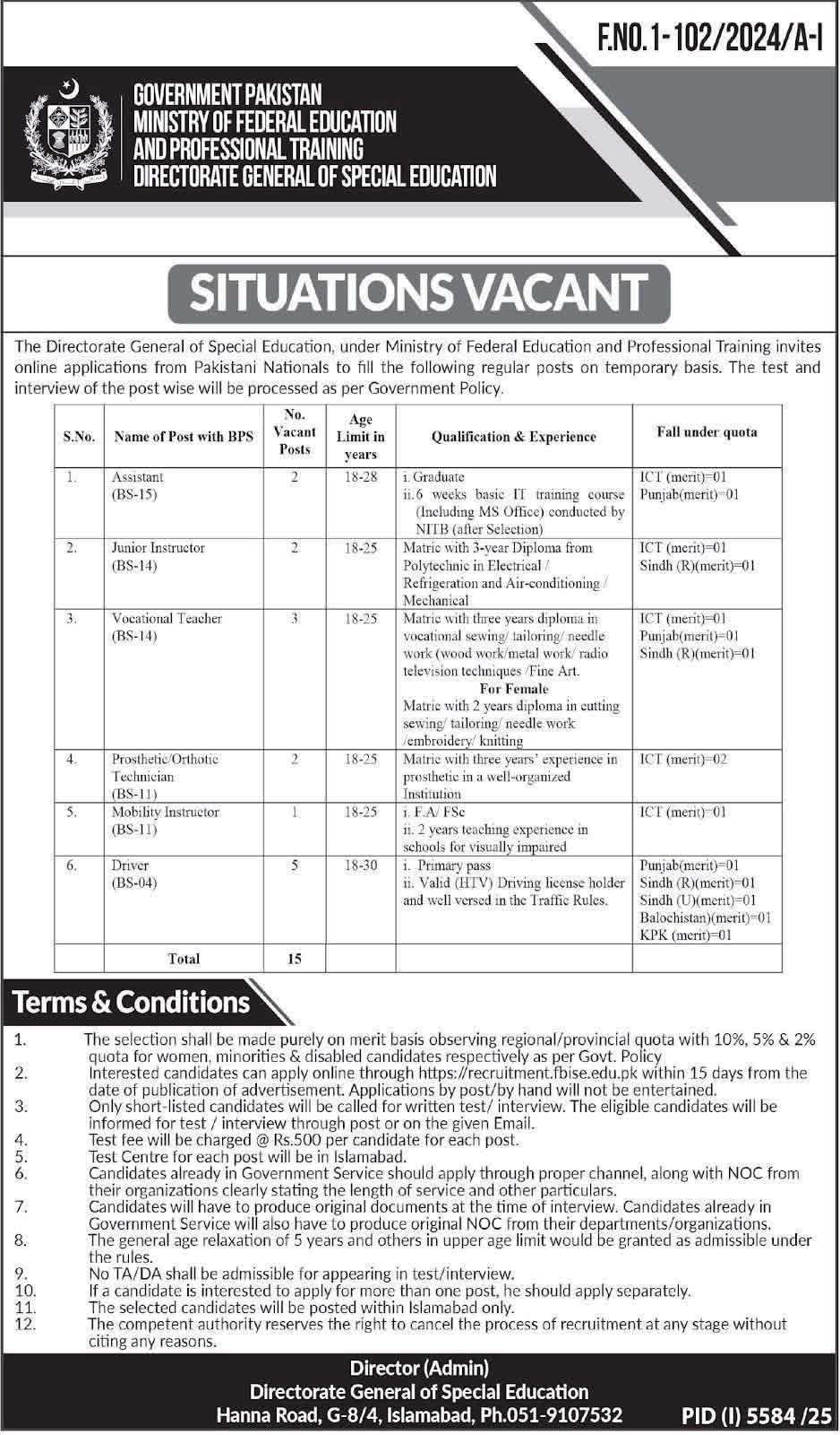 The Directorate General of Special Education (DGSE) in Islamabad is recruiting for 15 regular positions across various grades (BS-04 to BS-15). Key roles include Assistant, Junior Instructor, Vocational Teacher, and Driver. Candidates must meet specific educational criteria, ranging from Primary pass for drivers to Graduation for assistants. Applicants must be between 18 and 30 years old, depending on the post, with a general 5-year age relaxation provided. Applications must be submitted online via recruitment.fbise.edu.pk within 15 days of the advertisement. A test fee of Rs. 500 applies, and all testing will occur in Islamabad.