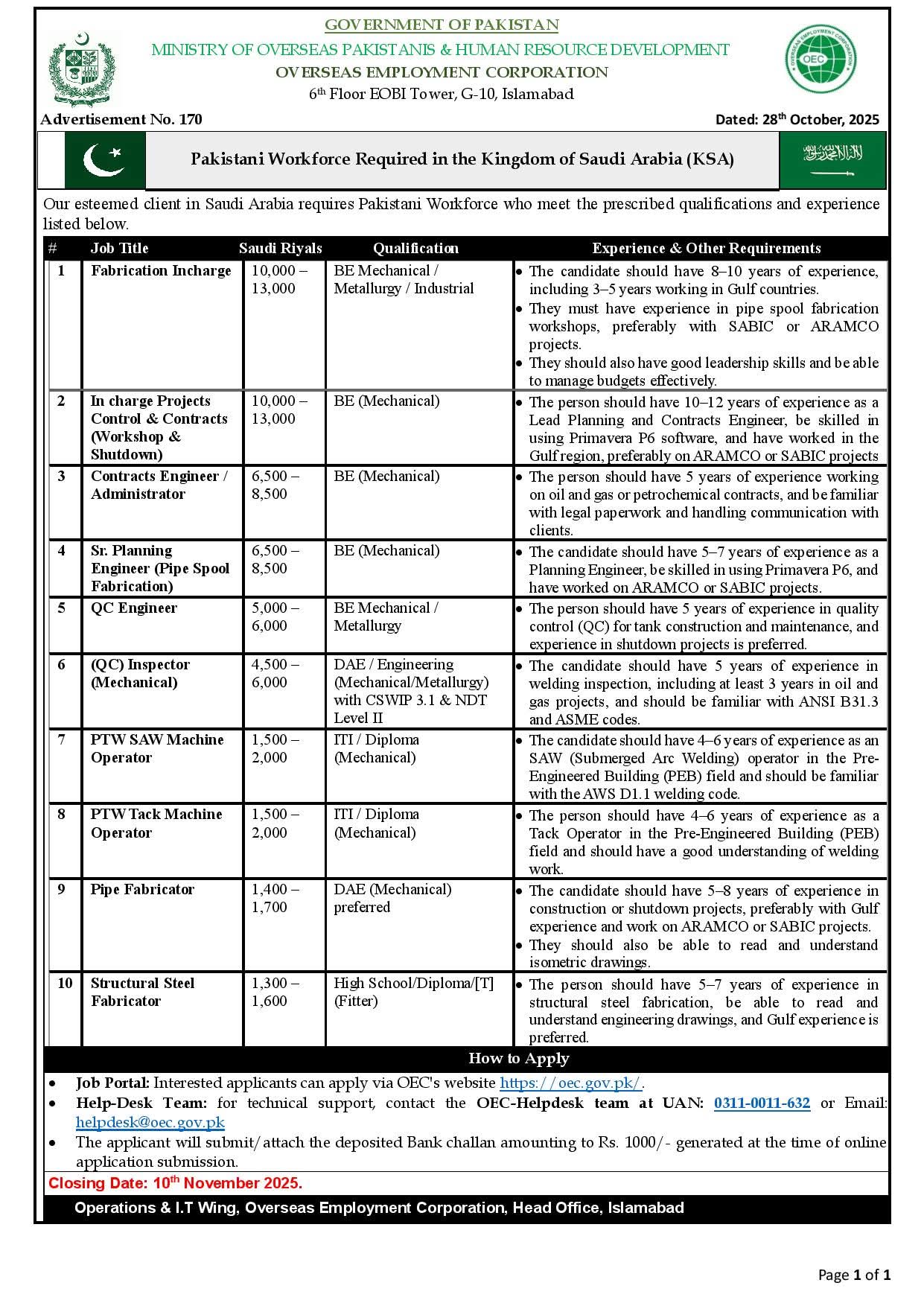 The Overseas Employment Corporation (OEC) has announced multiple job opportunities in Saudi Arabia for skilled Pakistani professionals under Advertisement No. 170, dated 28th October 2025. Positions include Fabrication Incharge, Project Control Engineer, Contracts Engineer, QC Inspector, and various technical operators. Candidates must hold relevant qualifications such as BE, DAE, or ITI with 4–12 years of experience, preferably on ARAMCO or SABIC projects. Attractive salaries ranging from 1,300 to 13,000 Saudi Riyals are offered. Interested applicants can apply online at [oec.gov.pk](https://oec.gov.pk) before 10th November 2025, with a Rs.1000 application processing fee.