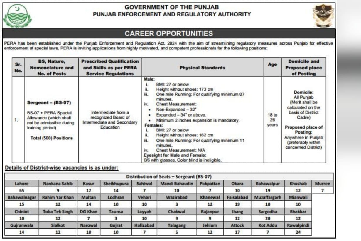 PERA Sergeant Recruitment (BS-07) The Government of the Punjab has announced 500 vacancies for the position of Sergeant (BS-07) under the newly established Punjab Enforcement and Regulatory Authority (PERA). Formed under the Punjab Enforcement and Regulation Act 2024, this authority aims to improve the enforcement of special laws and regulatory measures across the province. The roles are distributed across various districts on a District Cadre basis, with major hubs like Lahore (65 seats), Rawalpindi (24 seats), and Sargodha (20 seats) having the highest allocations. Candidates must possess a Punjab domicile and be between 18 to 26 years of age. Key Requirements: * Education: Minimum Intermediate (FA/FSc/ICS/I.Com). * Physical Fitness: Strict standards are in place for both genders. Males require a height of 173 cm and must complete a mile run in 7 minutes, while females require 162 cm and an 11-minute mile. Both must have a BMI of 27 or below and 6/6 vision (with glasses). * Compensation: Successful recruits receive a basic pay scale (BS-07) plus a PERA Special Allowance, though this allowance is only granted after the completion of the training period. This recruitment drive represents a significant effort to professionalize law enforcement at the district level, focusing on high-energy, physically fit individuals to uphold provincial regulations.